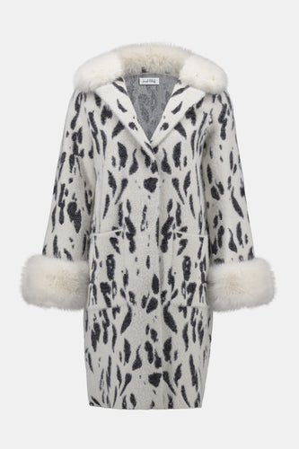 Feather Yarn Animal Jacquard Coat with Faux Fur Trim 253904