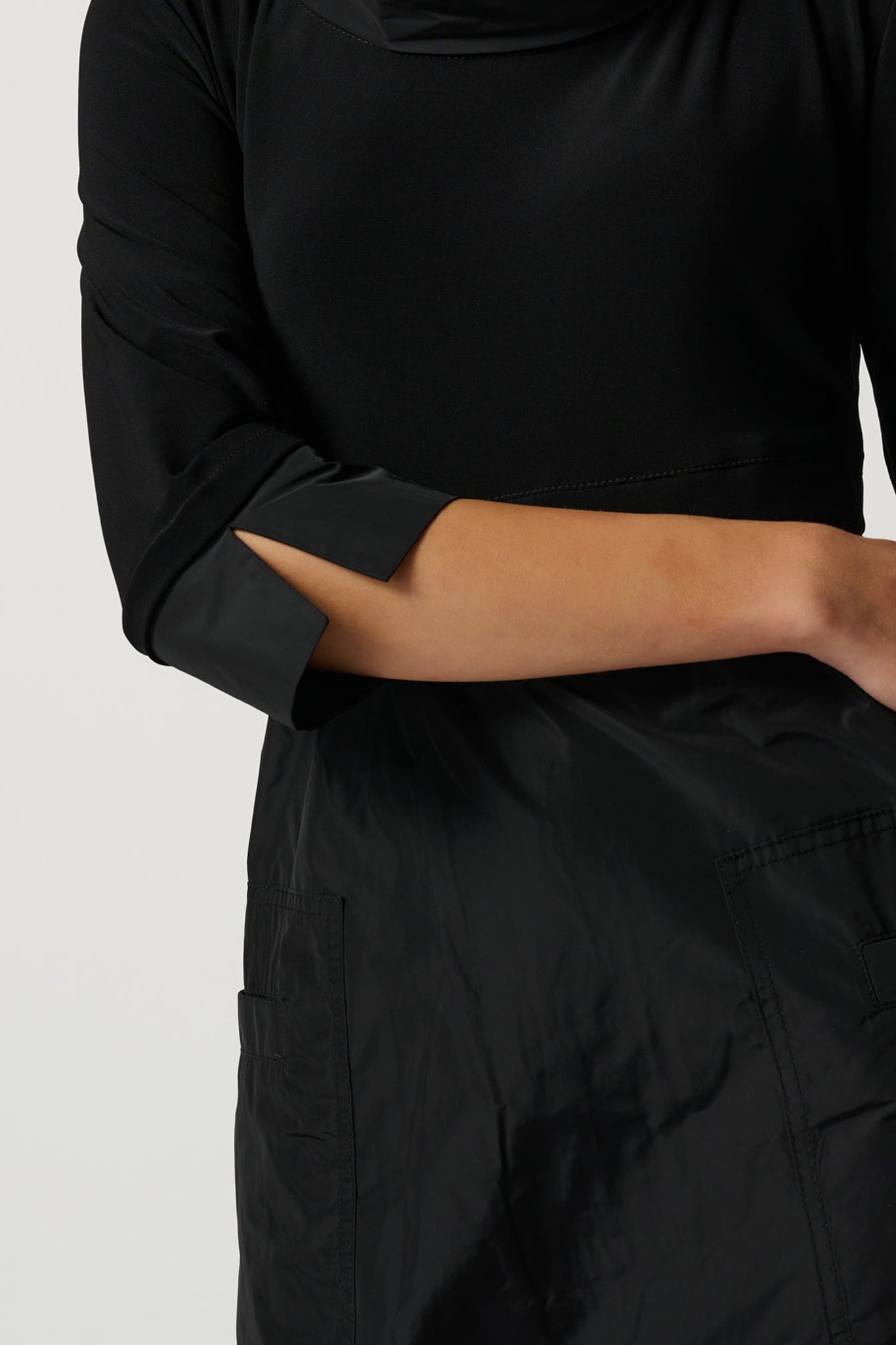 A figure-accentuating empire waist with feminine shirring detail and stand collar gives a poised appeal to this knee-length cocoon dress. Made with Memory fabric and a silky knit material, this ready-to-wear garment also features three-quarter length cuffed sleeves and front pockets.