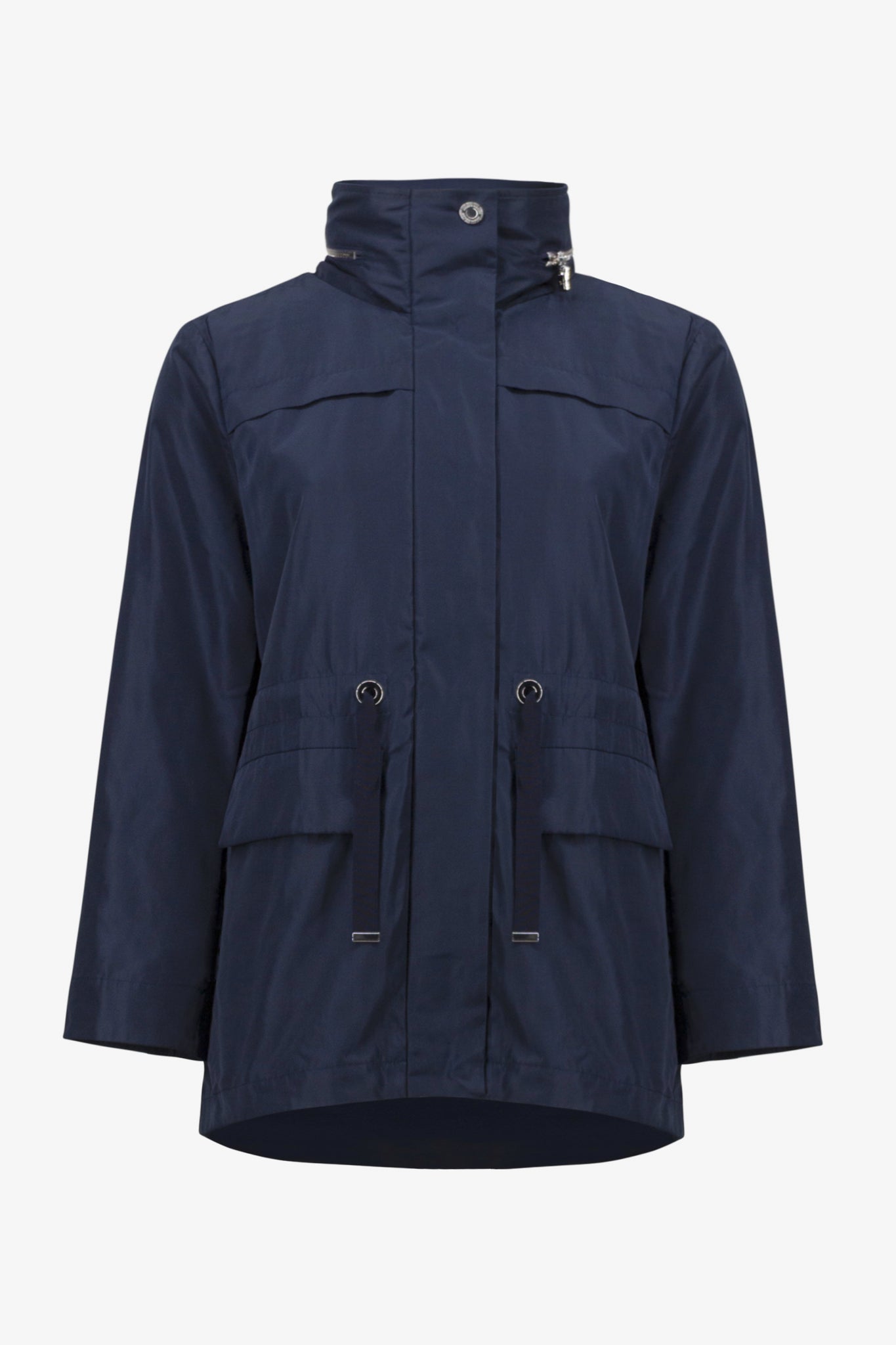 This stylish water resistant anorak brings everyday utility with a sleek, no-fuss silhouette. Snap-front placket, hidden zipper and grosgrain drawstring details meet flap pockets and a hidden hood that folds into the funnel collar.