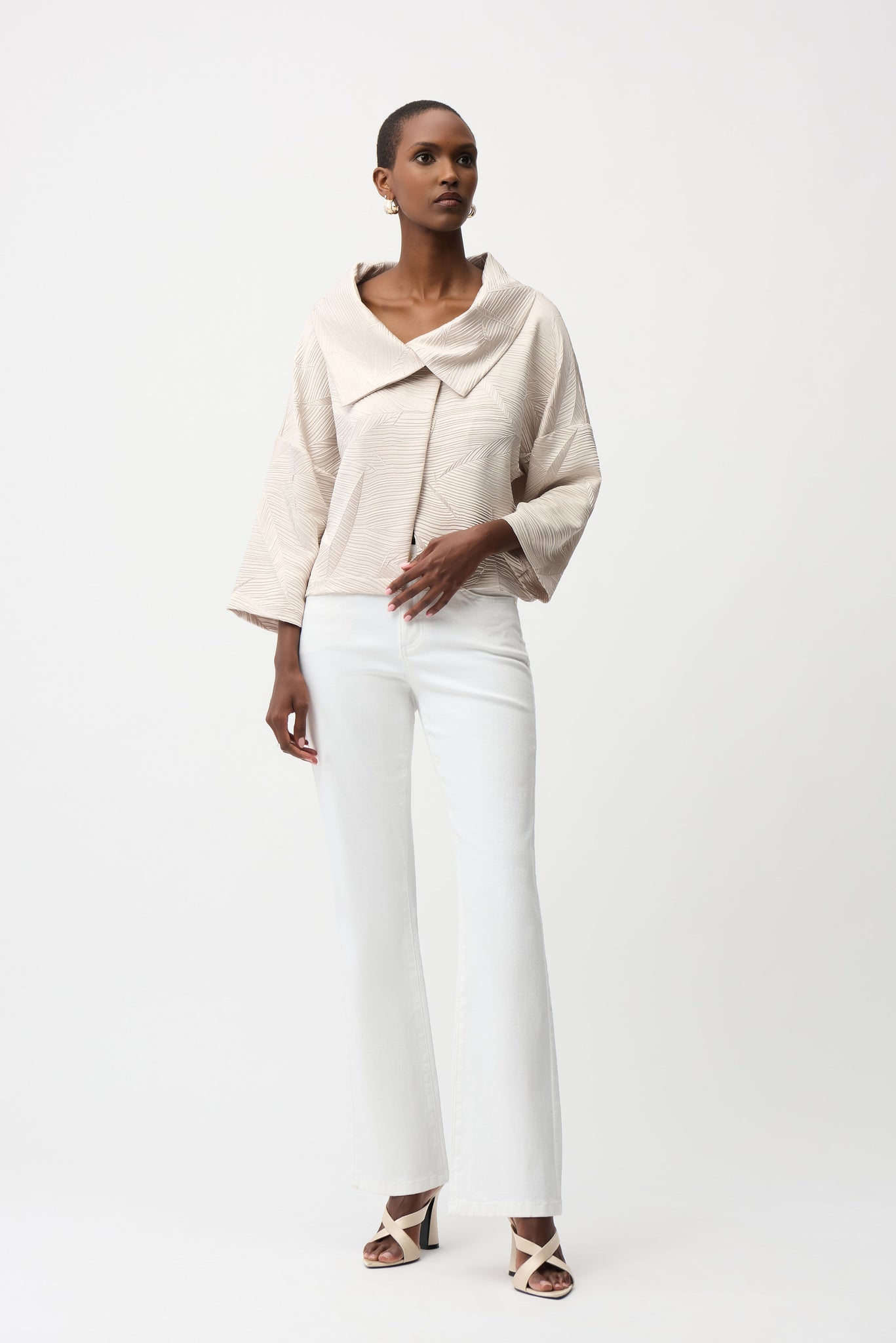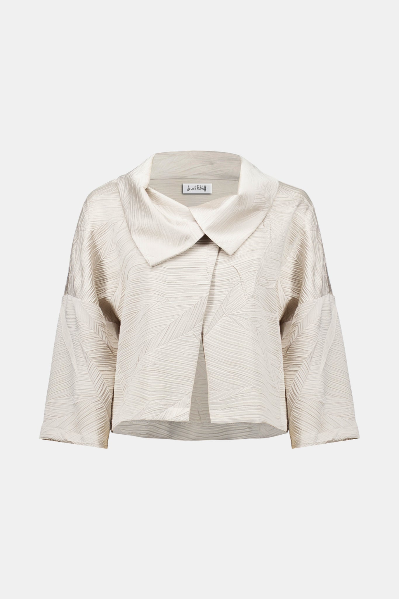 Elegant with a modern edge, this pleated satin boxy jacket features an overlapping collar detail and relaxed three-quarter sleeves, offering an elevated finish to any look.