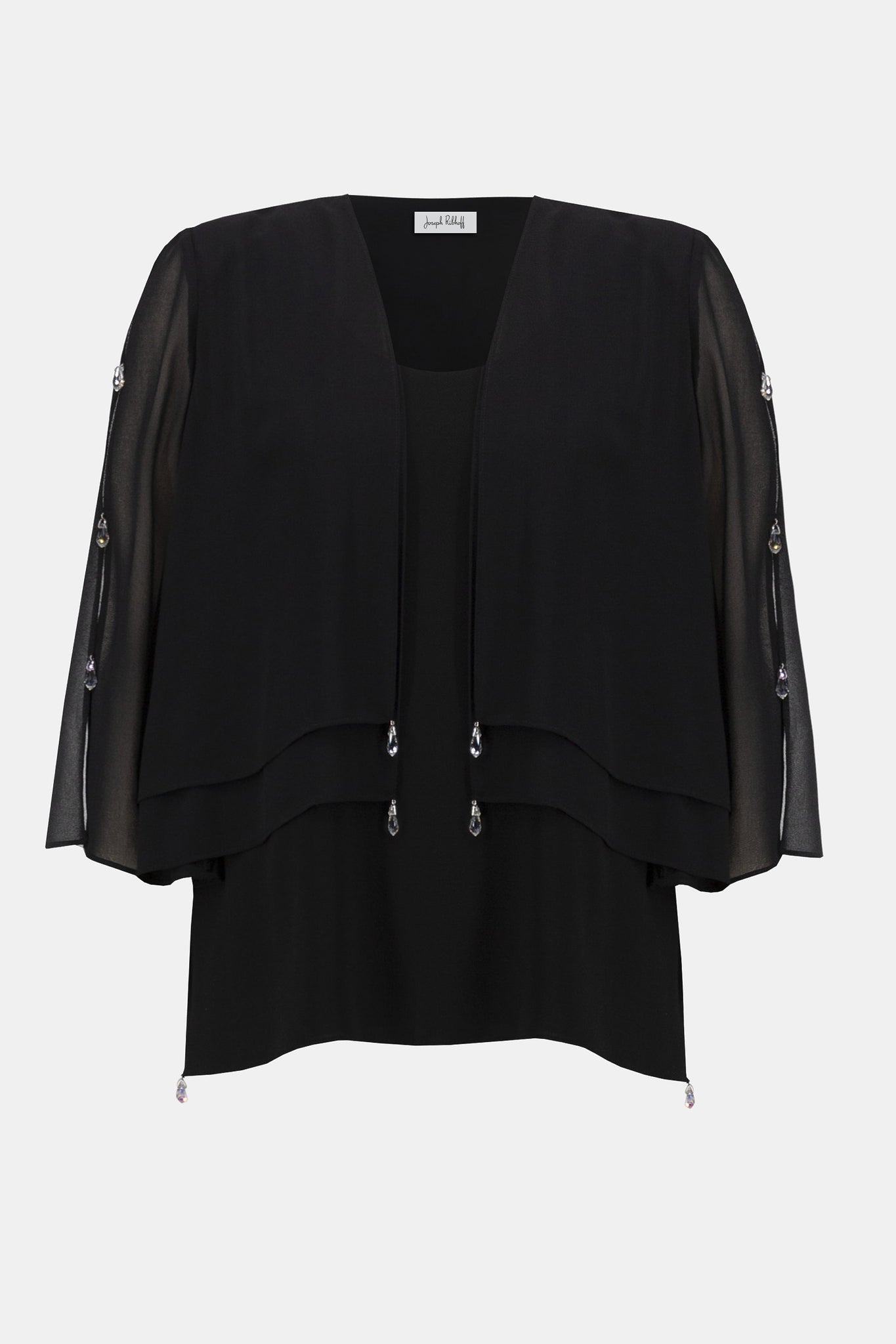Elevate your evening ensemble with this exquisite chiffon jacket, a must-have layering piece for nights out or special occasions. The statement lapel collar and scooped neckline frame the face beautifully, while the button-front closure adds a touch of flair. Three-quarter sleeves with subtle slit details at the cuffs enhance its sophisticated appeal, and the flared silhouette ensures graceful movement. Part of the Signature Collection.