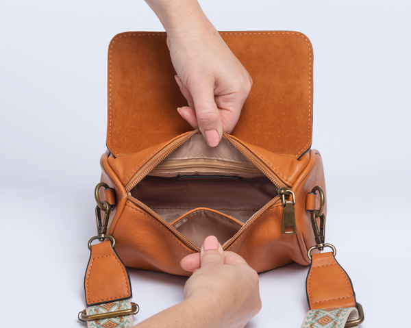 Crinkle Textured PU Material. Foldover Top with Snap Closure. Adjustable/Detachable Guitar Crossbody Strap. Detachable Short Carry Strap. 8"L x 4"W x 4.5"H. Antiqued Gold Hardware. (Interior Front) Slip Pocket. (Interior Back) Zip Pocket.