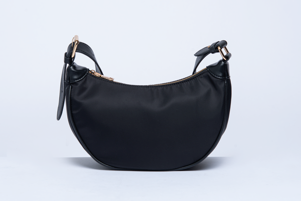 Sturdy Nylon Material. Top Zip Closure. Adjustable Wide Shoulder Strap with D-Ring Clip. 10.25"L x 3.25"W x 6.5"H. Shiny Gold or Silver Hardware. (Exterior Back) Slip Pocket. (Interior Front) Slip Pocket. (Interior Back) Zip Pocket.
