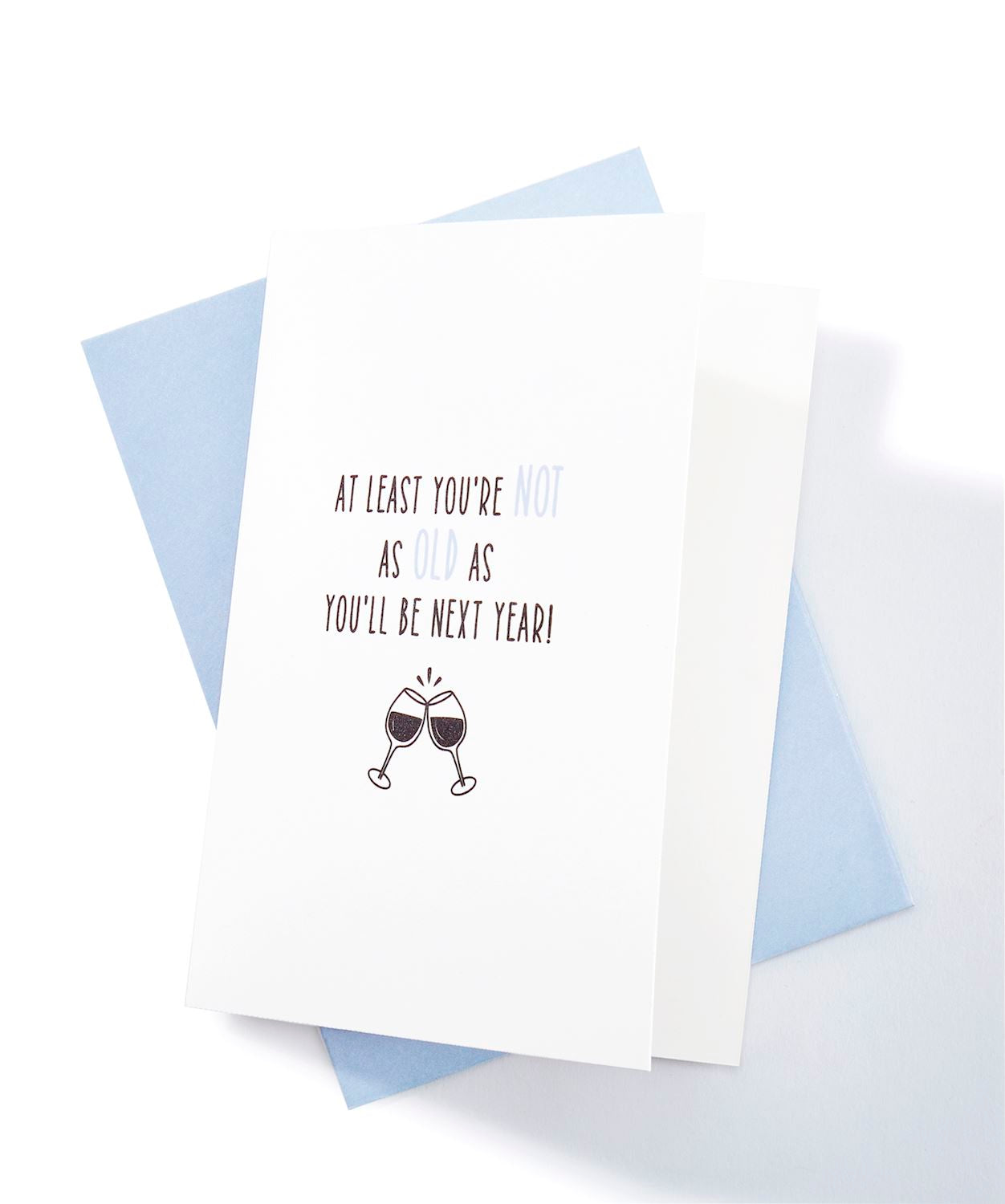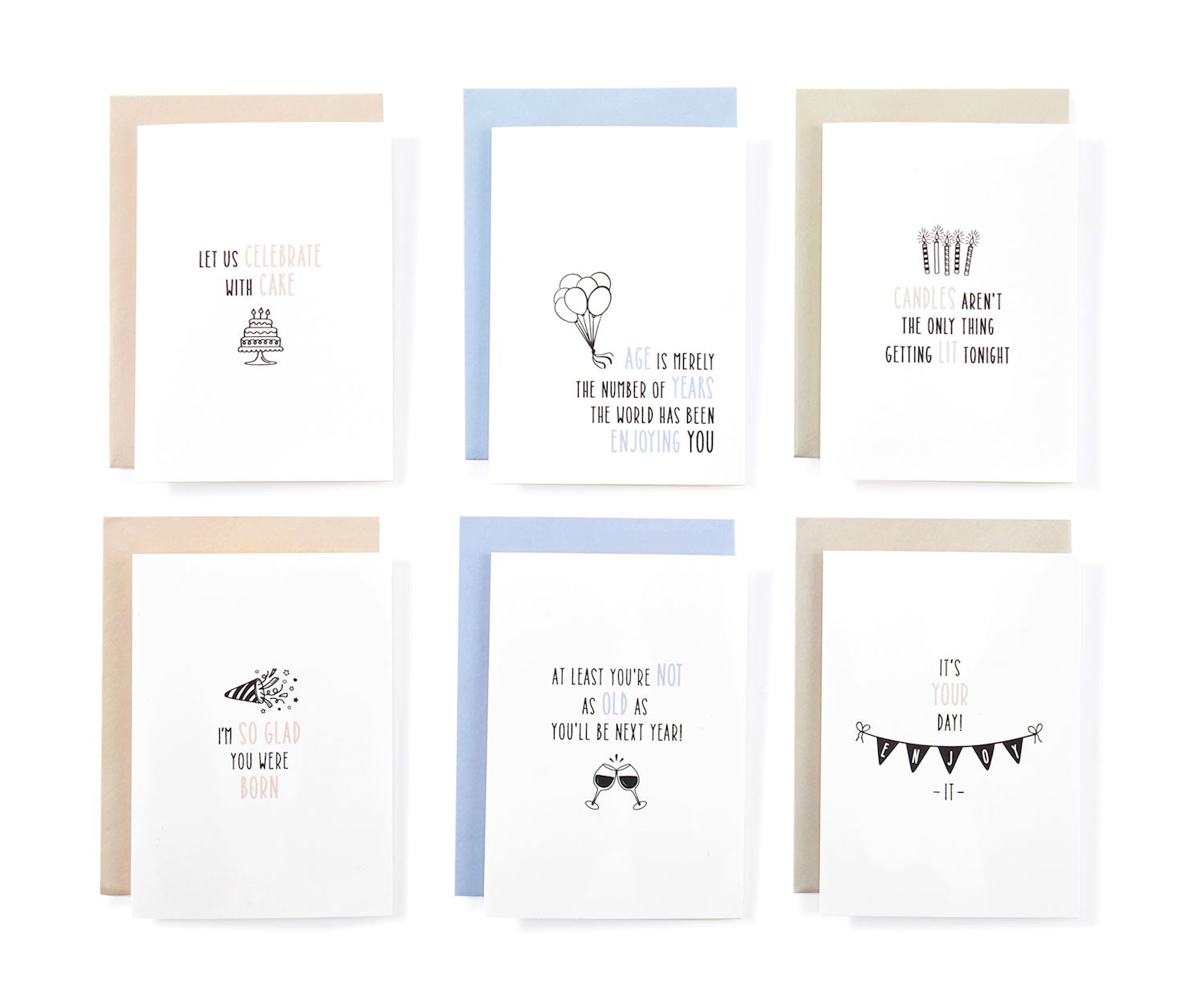 A must-have for birthdays, this Paper Greeting Card adds a fun and novel twist to classic sentiments. Featuring a white design with black illustrations and black and colored typography, this greeting card will elevate your gift-giving game. Available in 6 assorted styles with sentiments: Cake/LET US CELEBRATE WITH CAKE, Balloons/AGE IS MERELY THE NUMBER OF YEARS THE WORLD HAS BEEN ENJOYING YOU, Candles/CANDLES AREN'T THE ONLY THINGS GETTING LIT TONIGHT, Party Popper/I'M SO GLAD YOU WERE BORN, Wine Glasses/AT LEAST YOU'RE NOT AS OLD AS YOU'LL BE NEXT YEAR!, and Garland/IT'S YOUR DAY! ENJOY IT.