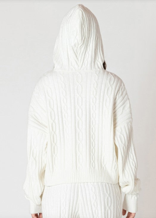 This snow coloured hooded cable sweater looks so cozy and warm.