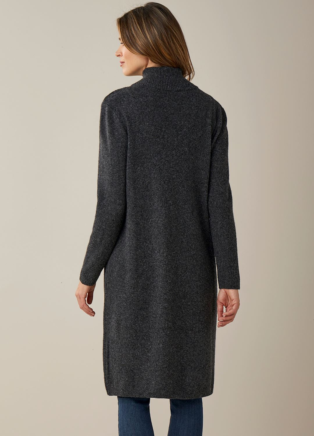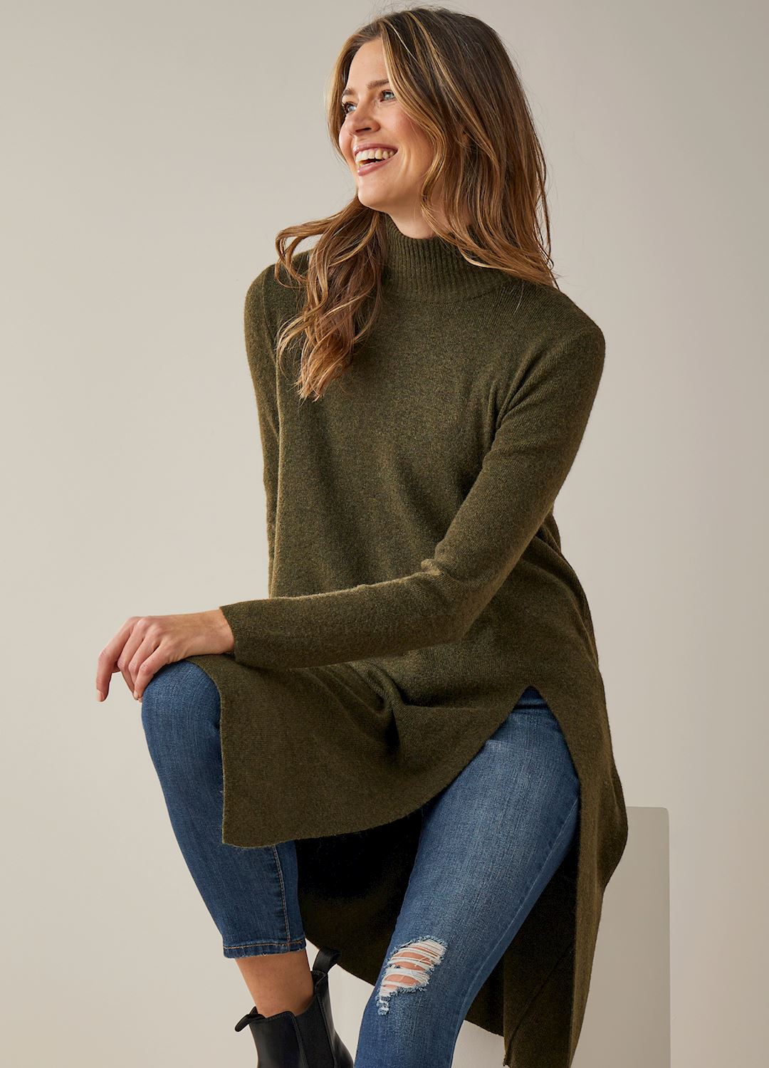 A luxe heathered knit in a lofty soft fabric, knee length tunic with long sleeves, mock neck, deep front side slit, all made of recycled fibers and wool blended perfectly with a relaxed fit. Available in 2 colours Heather Charcoal, Heather Olive.. 50% Recycled Polyester, 30% Nylon, 14% Polyester, 6% Fine Wool.