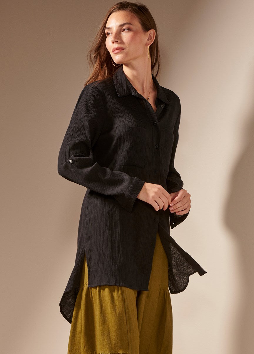 The classic crinkle long sleeve, button front shirt in a textured cotton, sleeve tabs, two large patch front pockets, high low hemline all with an oversize tunic length silhouette. Available in Black and Grey. 100% Cotton.