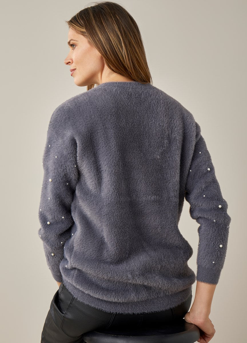 Soft lofty hair yarn in a straight easy fit crew neck, long dolman sleeves all edged in a rib knit decorated all over in beautiful large and small pearls. Available in 2 colors: Heather Charcoal and Heather Oatmeal. 67% Polyamide, 20% Viscose, 13% Polyester.