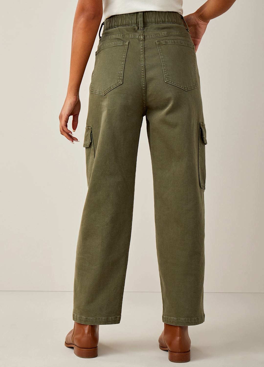 Easy relaxed mom fit cargo pant, with elasticized waistband, high waisted with functional flap pockets. Softly washed cotton in a trendy silhouette in beautiful earthy tones. Available in 2 colors: Khaki and Olive. 93% Cotton, 6% Polyester, 3% Spandex. Average model height approx. 5ft 9in, pant inseam length approx. is 27 inches.
